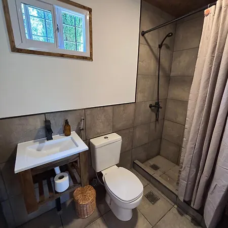 A separate toilet and a shower, along with a hairdryer and towels, are featured.